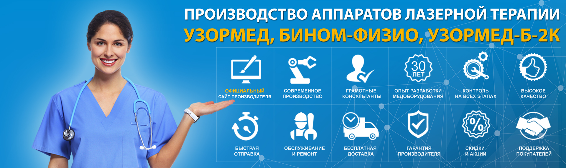 Производственно-конструкторское предприятие БИНОМ занимается разработкой, производством и продажей аппаратов лазерной терапии с 1992г. Наши аппараты лазерной терапии известны на российском рынке более 20 лет. В нашем интернет-магазине вы можете купить аппарат лазерной терапии для лечения широкого круга заболеваний. Если вы хотите купить аппарат лазерной терапии для дома, то тогда, возможно, вам подойдет аппарат лазеротерапии УзорМед, если вы хотите купить аппарат лазеротерапии для больницы или клиники, то тогда следует обратить внимание на профессиональные терапевтические комплексы на базе аппарата лазерной терапии УзорМед-Б-2к.